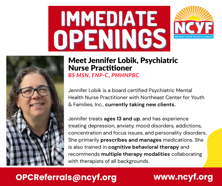 Jennifer Lobik is a board certified Psychiatric Mental Health Nurse Practitioner with Northeast Center for Youth & Families, Inc., currently taking new clients.